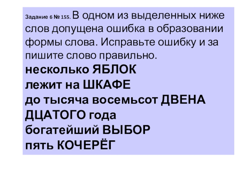 Слайд 4Задание 6 № 155. В одном из выделенных ниже слов допущена ошибка в образовании