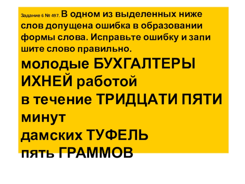 Слайд 13Задание 6 № 497. В одном из выделенных ниже слов допущена ошибка в образовании