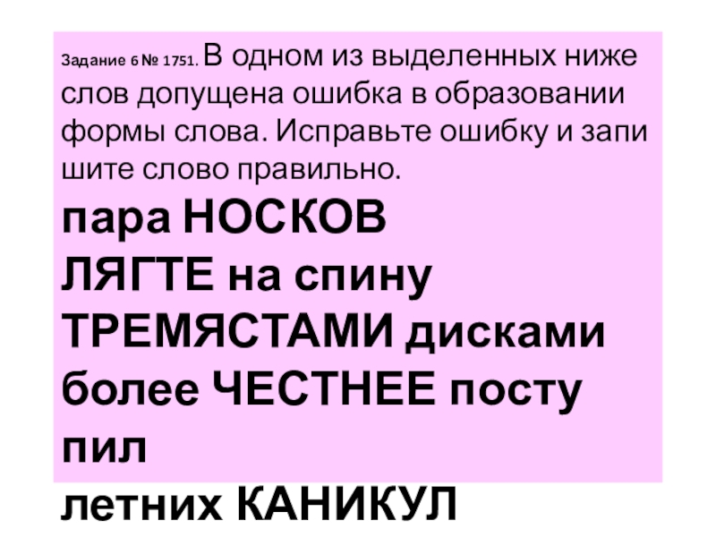 Слайд 38Задание 6 № 1751. В одном из выделенных ниже слов допущена ошибка в образовании