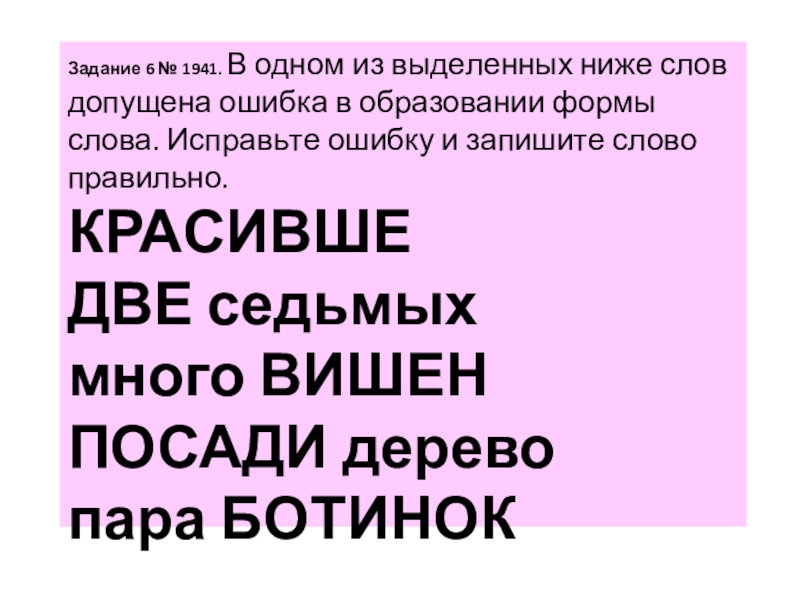 Слайд 43Задание 6 № 1941. В одном из выделенных ниже слов допущена ошибка в образовании