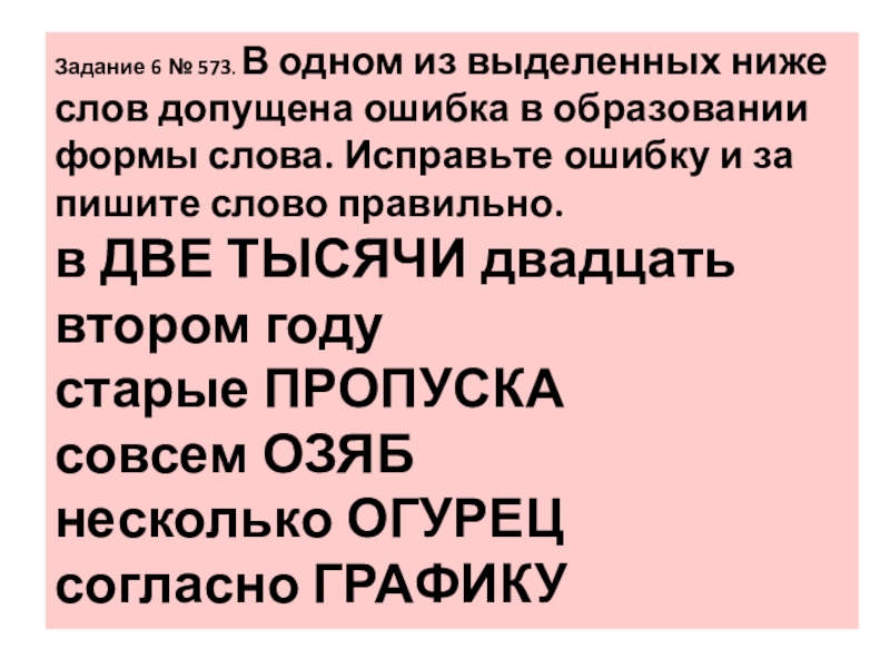 Слайд 15Задание 6 № 573. В одном из выделенных ниже слов допущена ошибка в образовании