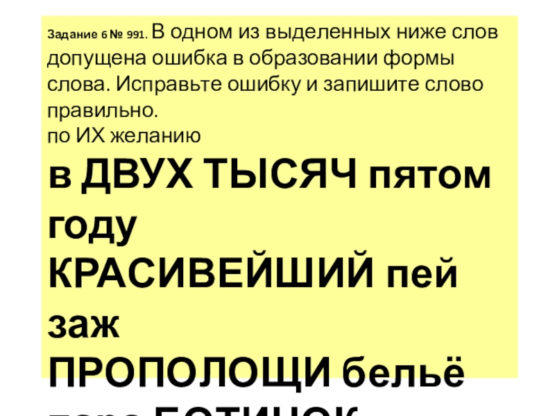Слайд 26Задание 6 № 991. В одном из выделенных ниже слов допущена ошибка в образовании