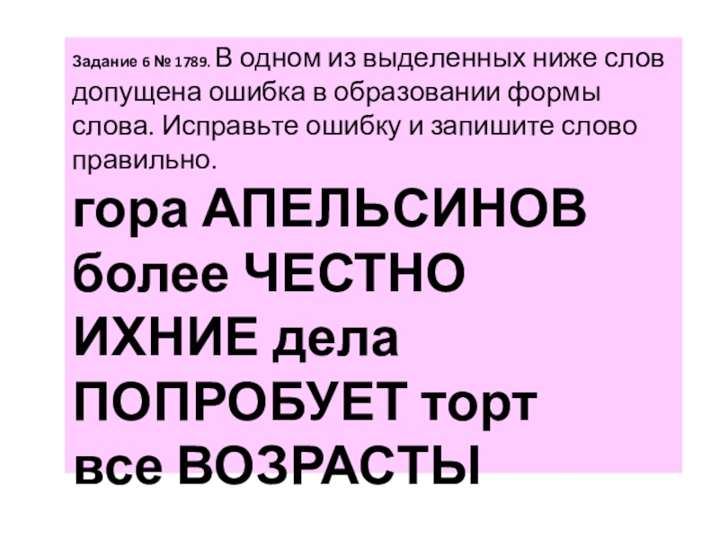 Слайд 39Задание 6 № 1789. В одном из выделенных ниже слов допущена ошибка в образовании