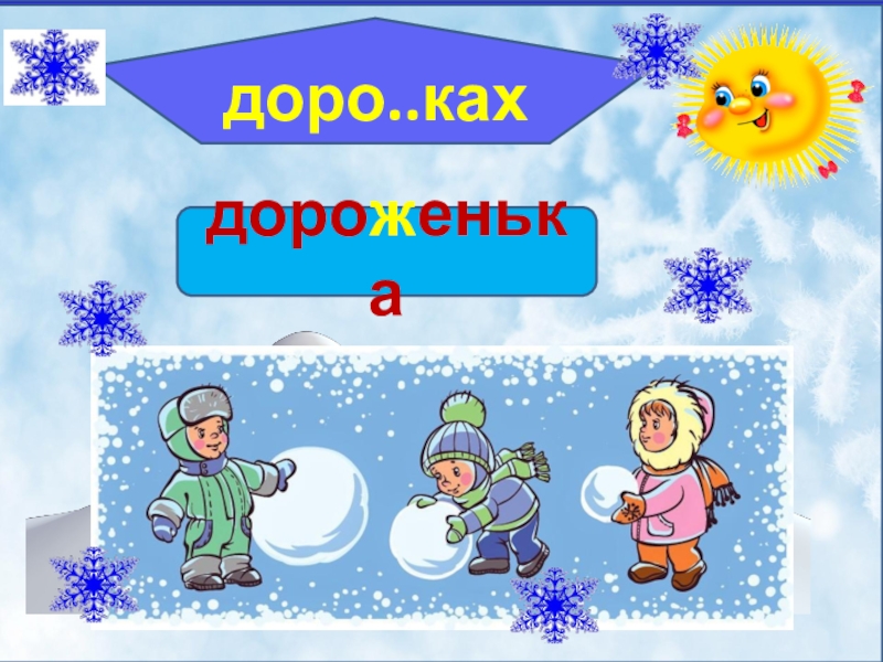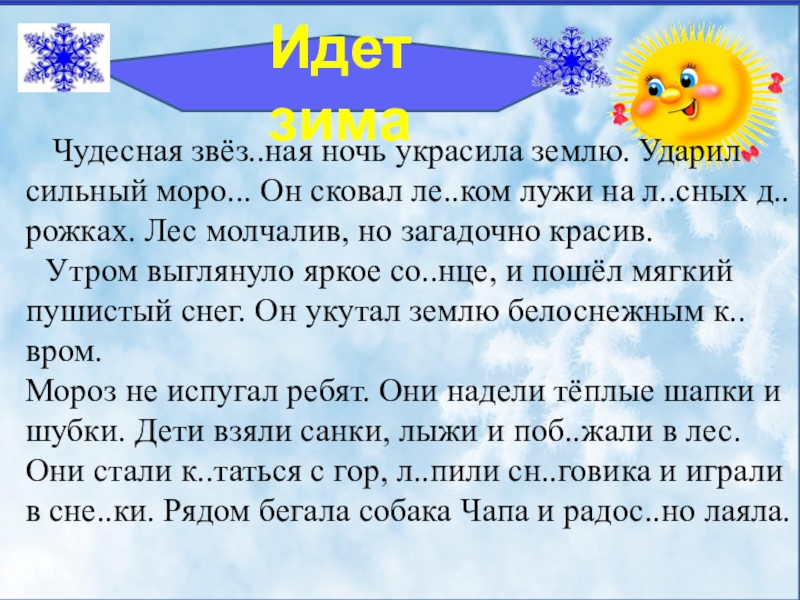Он сковал ле..ком лужи на л..сных д..рожках. Лес молчалив, но загадочно красив. Утром выглянуло яркое со..нце, и пошёл мягкий пушистый снег. Он укутал землю белоснежным к..вром. Мороз не испугал ребят. Они надели тёплые шапки и шубки. Дети взяли санки, лыжи и поб..жали в лес. Они стали к..таться с гор, л..пили сн..говика и играли в сне..ки. Рядом бегала собака Чапа и радос..но лаяла.
