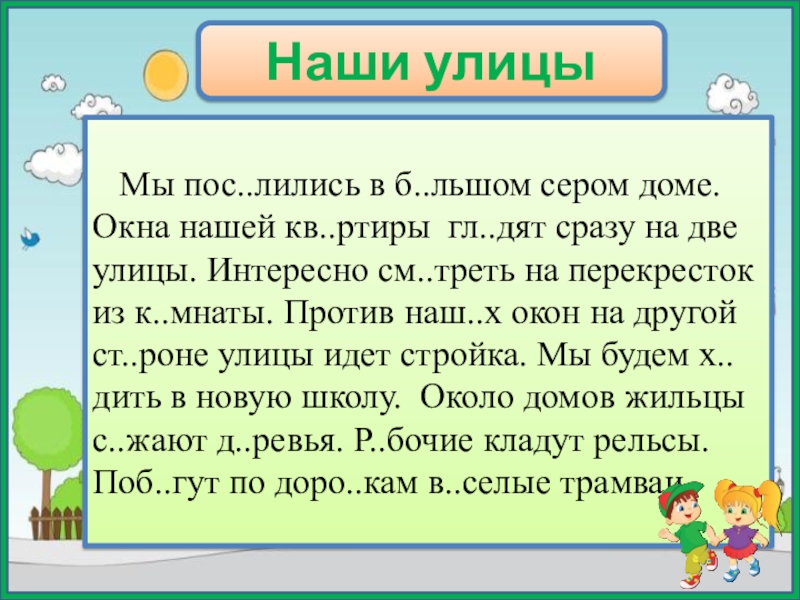 кв..ртиры гл..дят сразу на две улицы. Интересно см..треть на перекресток из к..мнаты. Против наш..х окон на другой ст..роне улицы идет стройка. Мы будем х..дить в новую школу. Около домов жильцы с..жают д..ревья. Р..бочие кладут рельсы. Поб..гут по доро..кам в..селые трамваи.