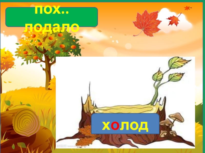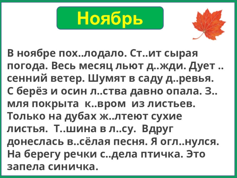 НоябрьВ ноябре пох..лодало. Ст..ит сырая погода. Весь месяц льют д..жди. Дует ..сенний ветер. Шумят в саду д..ревья.