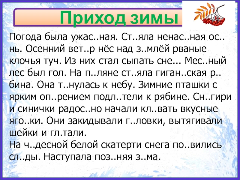 з..млёй рваные клочья туч. Из них стал сыпать сне... Мес..ный лес был гол. На п..ляне ст..яла гиган..ская р..бина. Она т..нулась к небу. Зимние пташки с ярким оп..рением подл..тели к рябине. Сн..гири и синички радос..но начали кл..вать вкусные яго..ки. Они закидывали г..ловки, вытягивали шейки и гл.тали. На ч..десной белой скатерти снега по..вились сл..ды. Наступала поз..няя з..ма.