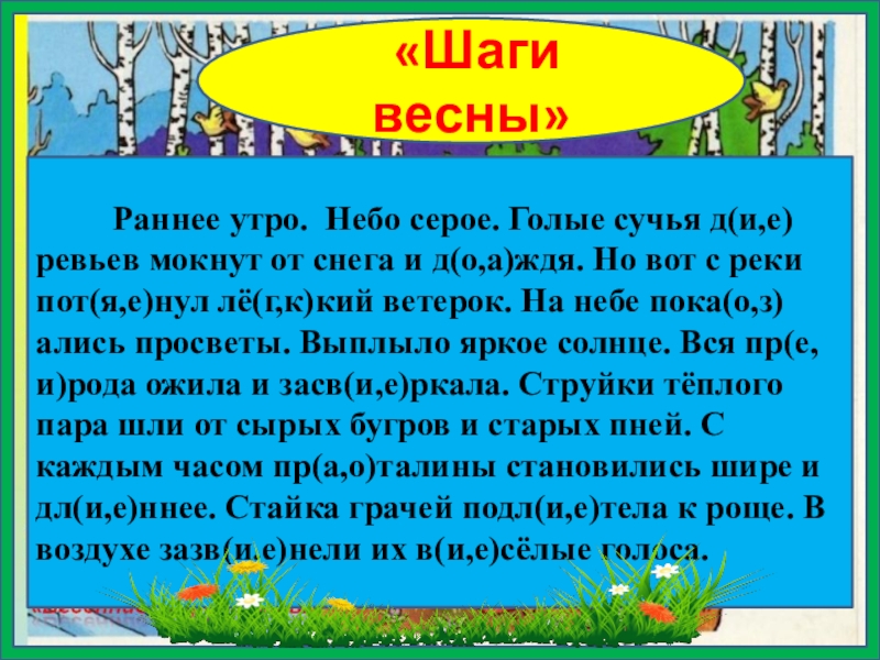 серое. Голые сучья д(и,е)ревьев мокнут от снега и д(о,а)ждя. Но вот с реки пот(я,е)нул лё(г,к)кий ветерок. На небе пока(о,з)ались просветы. Выплыло яркое солнце. Вся пр(е,и)рода ожила и засв(и,е)ркала. Струйки тёплого пара шли от сырых бугров и старых пней. С каждым часом пр(а,о)талины становились шире и дл(и,е)ннее. Стайка грачей подл(и,е)тела к роще. В воздухе зазв(и,е)нели их в(и,е)сёлые голоса.