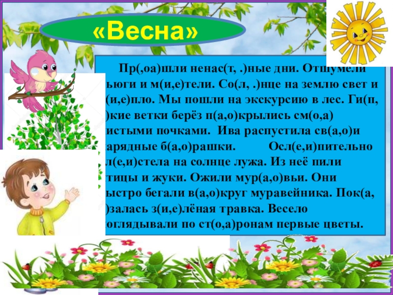 вьюги и м(и,е)тели. Со(л, .)нце на землю свет и т(и,е)пло. Мы пошли на экскурсию в лес. Ги(п,б)кие ветки берёз п(а,о)крылись см(о,а)листыми почками. Ива распустила св(а,о)и нарядные б(а,о)рашки. Осл(е,и)пительно бл(е,и)стела на солнце лужа. Из неё пили птицы и жуки. Ожили мур(а,о)вьи. Они быстро бегали в(а,о)круг муравейника. Пок(а,о)залась з(и,е)лёная травка. Весело поглядывали по ст(о,а)ронам первые цветы.