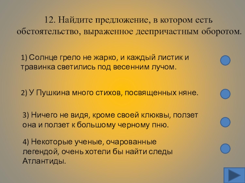 1) Солнце грело не жарко, и каждый листик и травинка светились под весенним лучом.