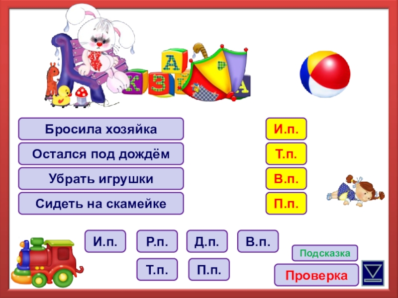 http://s15.radikal.ru/i189/1209/cb/54f087be8e62.jpg кукла, паровозик, мяч, машина, собака