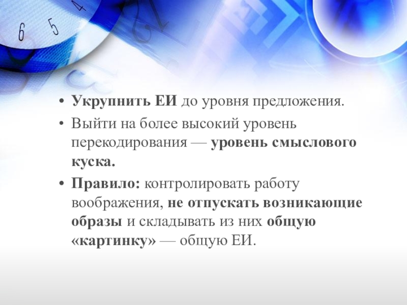 Правило: контролировать работу воображения, не отпускать возникающие образы и складывать из них общую «картинку» — общую ЕИ.