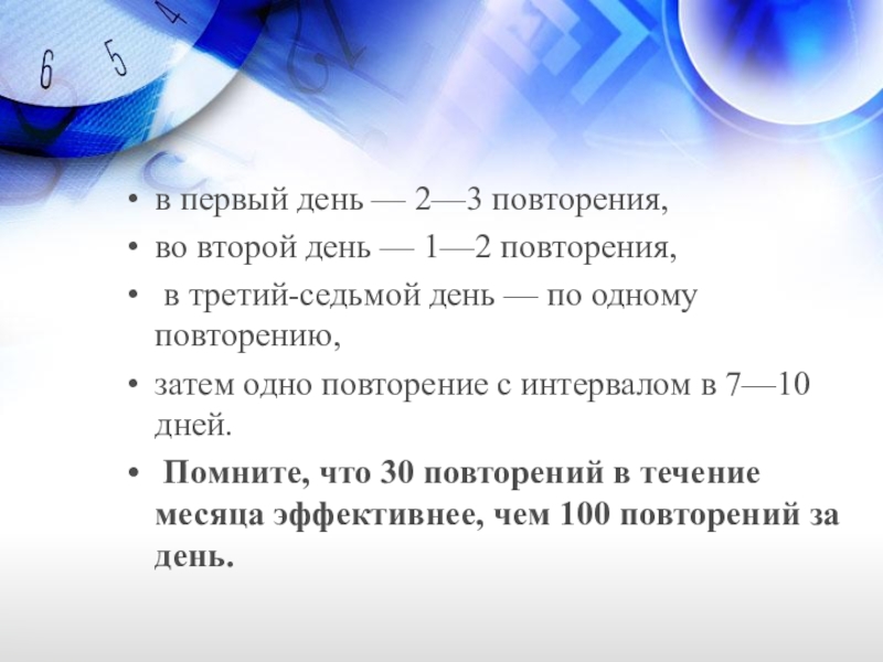 Помните, что 30 повторений в течение месяца эффективнее, чем 100 повторений за день.
