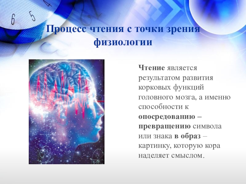 корковых функций головного мозга, а именно способности к опосредованию – превращению символа или знака в образ – картинку, которую кора наделяет смыслом.