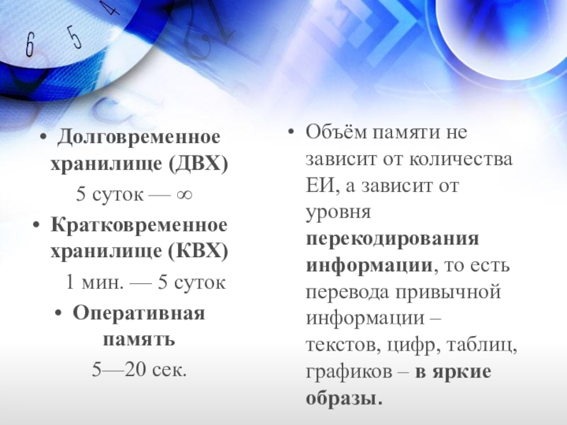 Объём памяти не зависит от количества ЕИ, а зависит от уровня перекодирования информации, то есть перевода привычной информации – текстов, цифр, таблиц, графиков – в яркие образы.
