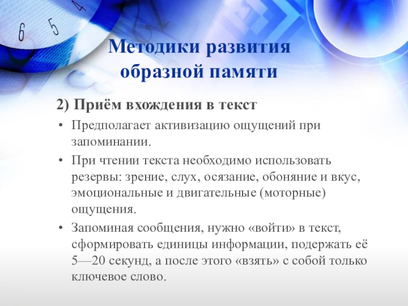 При чтении текста необходимо использовать резервы: зрение, слух, осязание, обоняние и вкус, эмоциональные и двигательные (моторные) ощущения.