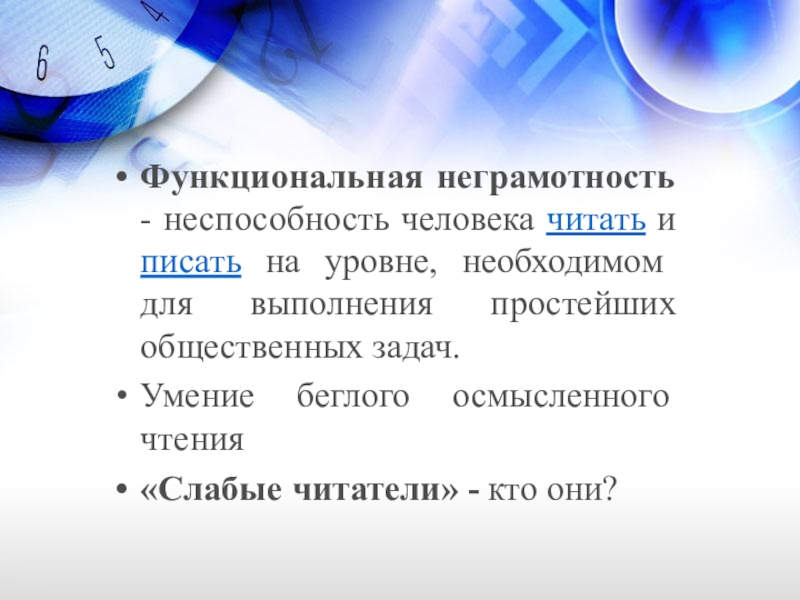 Слайд 2Функциональная неграмотность - неспособность человека читать и писать на уровне, необходимом