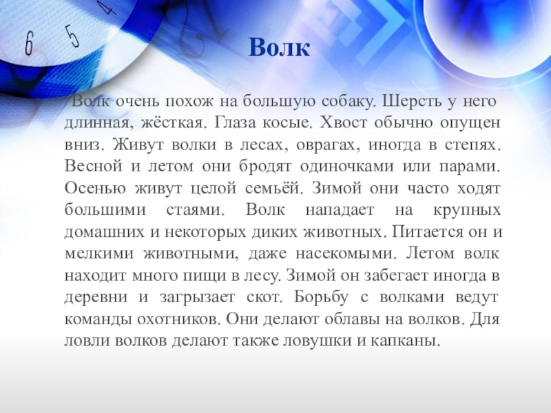 него длинная, жёсткая. Глаза косые. Хвост обычно опущен вниз. Живут волки в лесах, оврагах, иногда в степях. Весной и летом они бродят одиночками или парами. Осенью живут целой семьёй. Зимой они часто ходят большими стаями. Волк нападает на крупных домашних и некоторых диких животных. Питается он и мелкими животными, даже насекомыми. Летом волк находит много пищи в лесу. Зимой он забегает иногда в деревни и загрызает скот. Борьбу с волками ведут команды охотников. Они делают облавы на волков. Для ловли волков делают также ловушки и капканы.