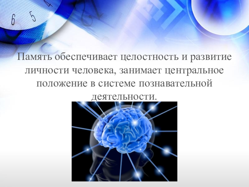 Слайд 4Память обеспечивает целостность и развитие личности человека, занимает центральное положение в