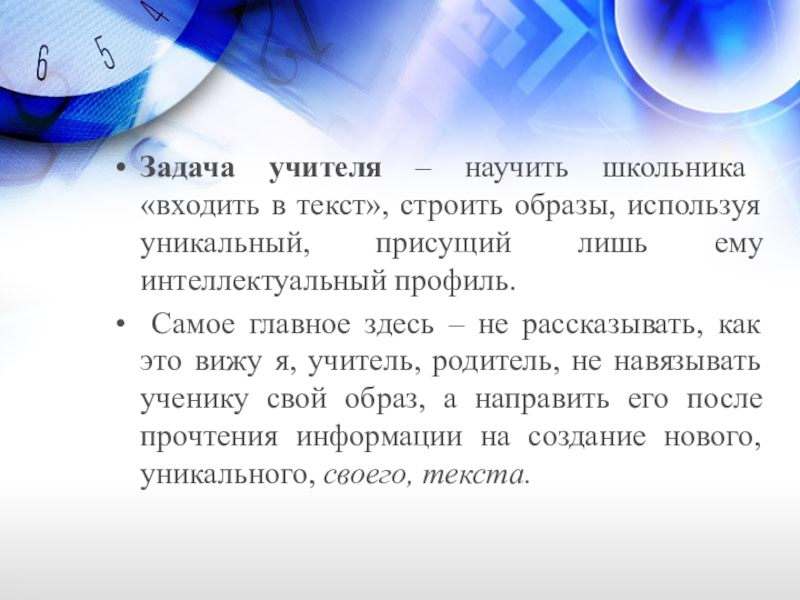 Слайд 12Задача учителя – научить школьника «входить в текст», строить образы, используя