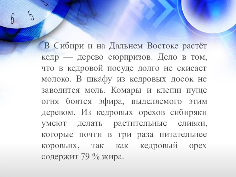 дерево сюрпризов. Дело в том, что в кедровой посуде долго не скисает молоко. В шкафу из кедровых досок не заводится моль. Комары и клещи пуще огня боятся эфира, выделяемого этим деревом. Из кедровых орехов сибиряки умеют делать растительные сливки, которые почти в три раза питательнее коровьих, так как кедровый орех содержит 79 % жира.