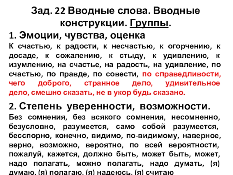 Слайд 3Зад. 22 Вводные слова. Вводные конструкции. Группы.