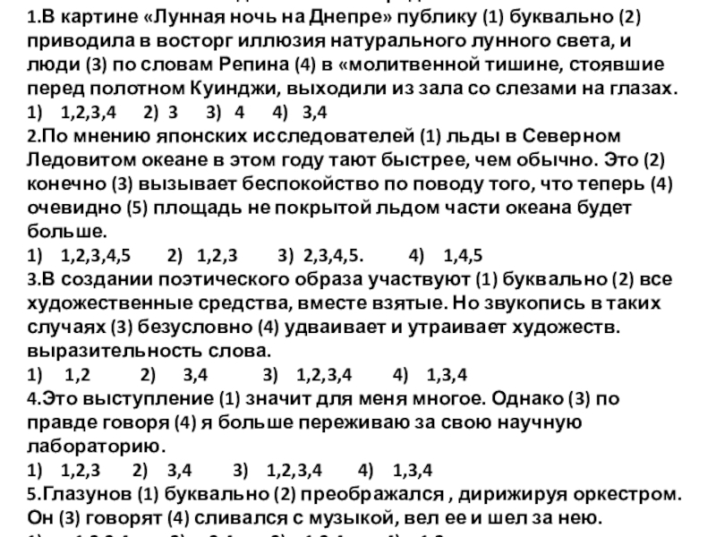 3.В создании поэтического образа участвуют (1) буквально (2) все художественные средства, вместе взятые. Но звукопись в таких случаях (3) безусловно (4) удваивает и утраивает художеств. выразительность слова.