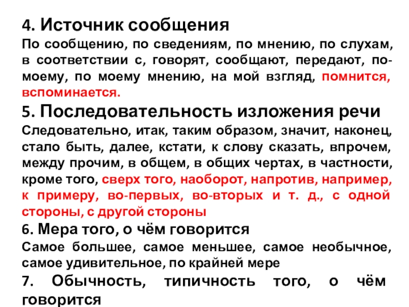 соответствии с, говорят, сообщают, передают, по-моему, по моему мнению, на мой взгляд, помнится, вспоминается.