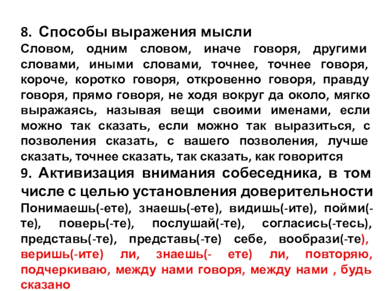 9. Активизация внимания собеседника, в том числе с целью установления доверительности