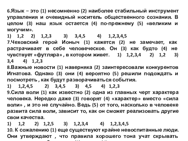 7.Чеховский герой Ионыч (1) кажется (2) не замечает, как растрачивает в себе человеческое. Он (3) как будто (4) не чувствует «футляра» , в котором живет. 1) 1,2,3,4 2) 1,2 3) 3,4 4) 1,2,3