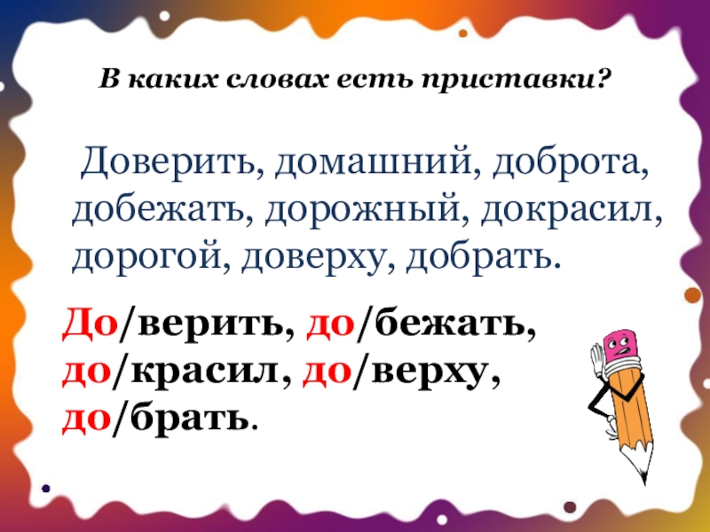 До/верить, до/бежать, до/красил, до/верху, до/брать.