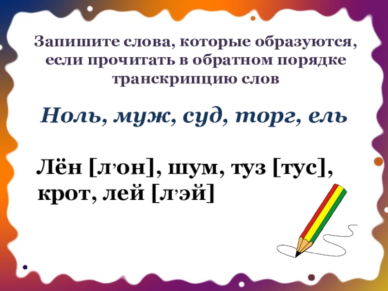 Лён [л,он], шум, туз [тус], крот, лей [л,эй]