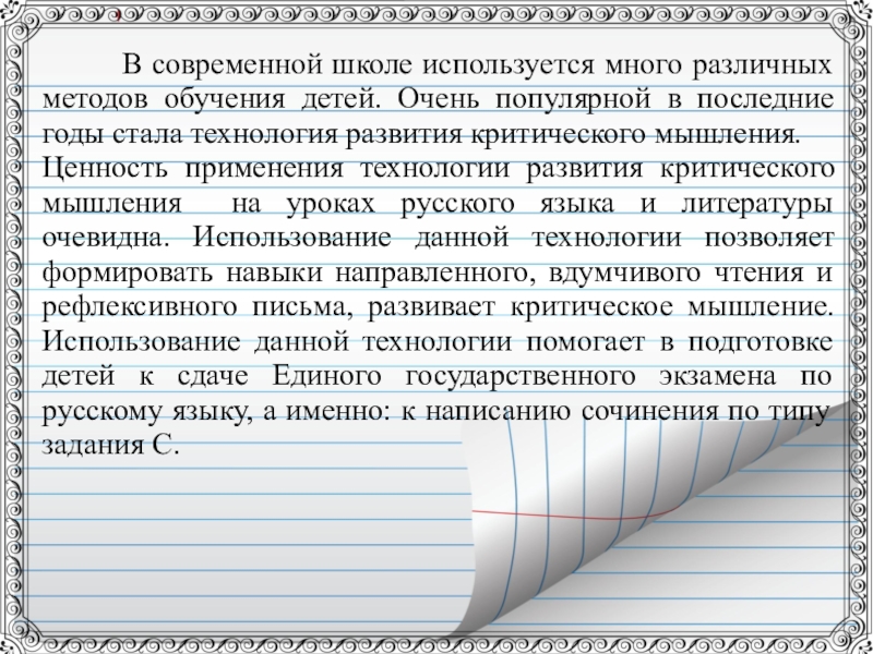 Ценность применения технологии развития критического мышления на уроках русского языка и литературы очевидна. Использование данной технологии позволяет формировать навыки направленного, вдумчивого чтения и рефлексивного письма, развивает критическое мышление. Использование данной технологии помогает в подготовке детей к сдаче Единого государственного экзамена по русскому языку, а именно: к написанию сочинения по типу задания С.
