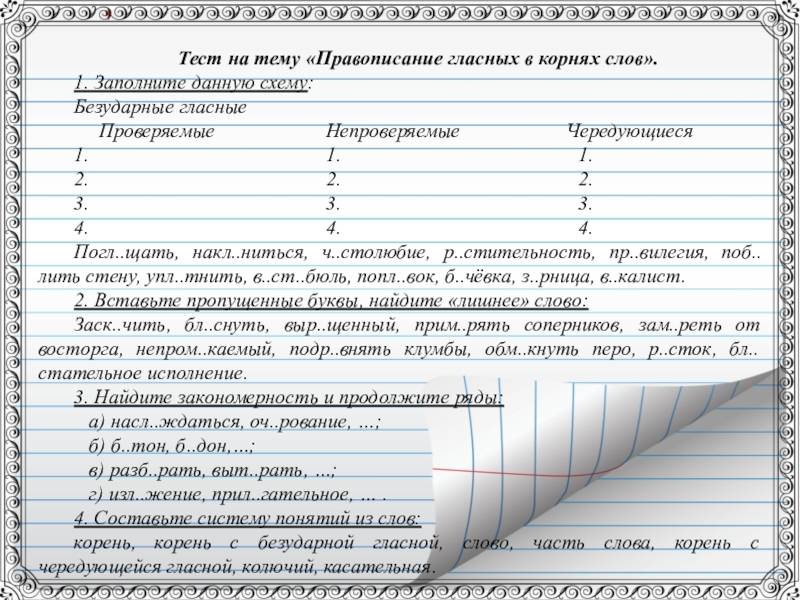 Слайд 5Тест на тему «Правописание гласных в корнях слов».