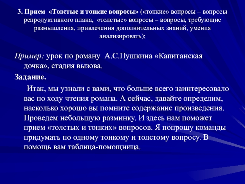 плана, «толстые» вопросы – вопросы, требующие размышления, привлечения дополнительных знаний, умения анализировать);