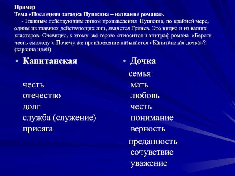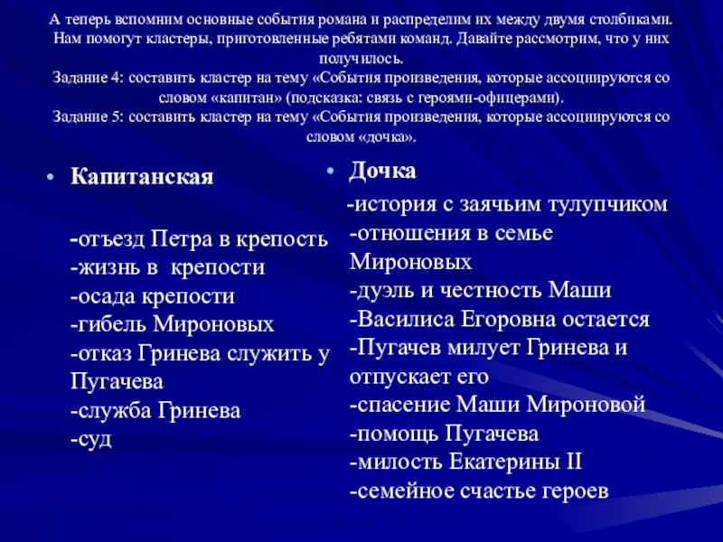 Задание 4: составить кластер на тему «События произведения, которые ассоциируются со словом «капитан» (подсказка: связь с героями-офицерами).
