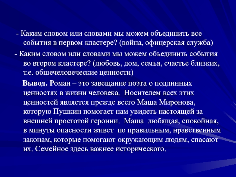 Вывод. Роман – это завещание поэта о подлинных ценностях в жизни человека. Носителем всех этих ценностей является прежде всего Маша Миронова, которую Пушкин помогает нам увидеть настоящей за внешней простотой героини. Маша любящая, спокойная, в минуты опасности живет по правильным, нравственным законам, которые помогают окружающим людям, спасают их. Семейное здесь важнее исторического.