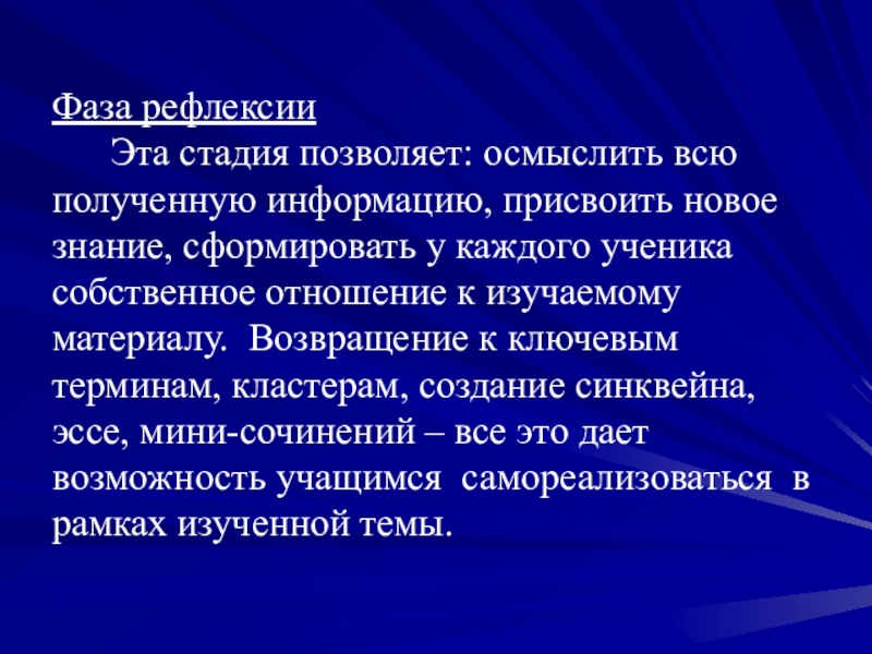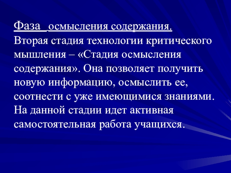 содержания». Она позволяет получить новую информацию, осмыслить ее, соотнести с уже имеющимися знаниями. На данной стадии идет активная самостоятельная работа учащихся.