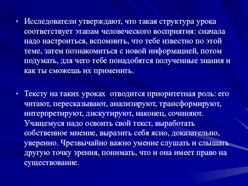 Слайд 4Исследователи утверждают, что такая структура урока соответствует этапам человеческого восприятия: сначала