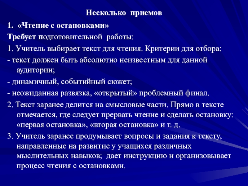 2. Текст заранее делится на смысловые части. Прямо в тексте отмечается, где следует прервать чтение и сделать остановку: «первая остановка», «вторая остановка» и т. д.