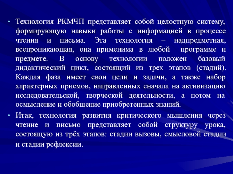 Технология РКМЧП представляет собой целостную систему, формирующую навыки работы с информацией