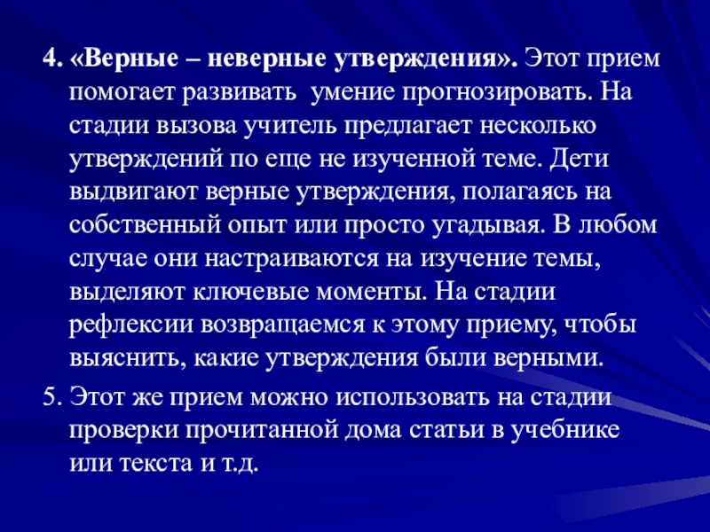 На стадии вызова учитель предлагает несколько утверждений по еще не изученной теме. Дети выдвигают верные утверждения, полагаясь на собственный опыт или просто угадывая. В любом случае они настраиваются на изучение темы, выделяют ключевые моменты. На стадии рефлексии возвращаемся к этому приему, чтобы выяснить, какие утверждения были верными.