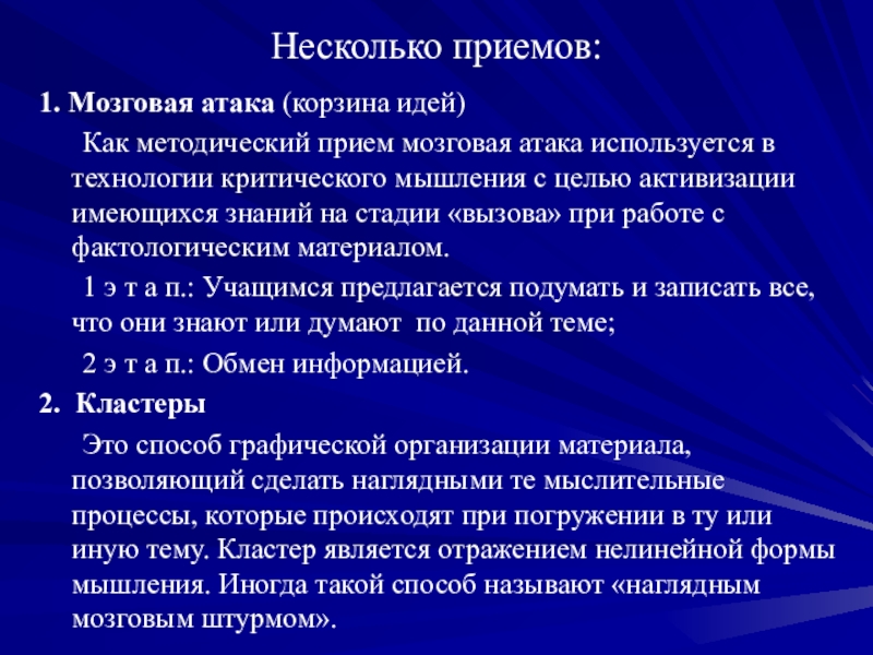 Это способ графической организации материала, позволяющий сделать наглядными те мыслительные процессы, которые происходят при погружении в ту или иную тему. Кластер является отражением нелинейной формы мышления. Иногда такой способ называют «наглядным мозговым штурмом».