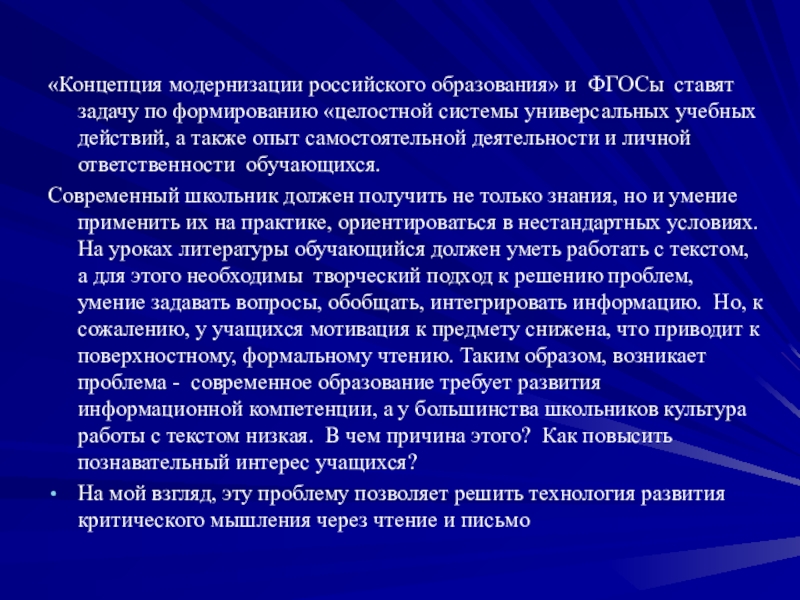 Слайд 2«Концепция модернизации российского образования» и ФГОСы ставят задачу по формированию «целостной