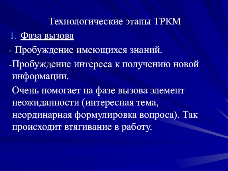 Очень помогает на фазе вызова элемент неожиданности (интересная тема, неординарная формулировка вопроса). Так происходит втягивание в работу.