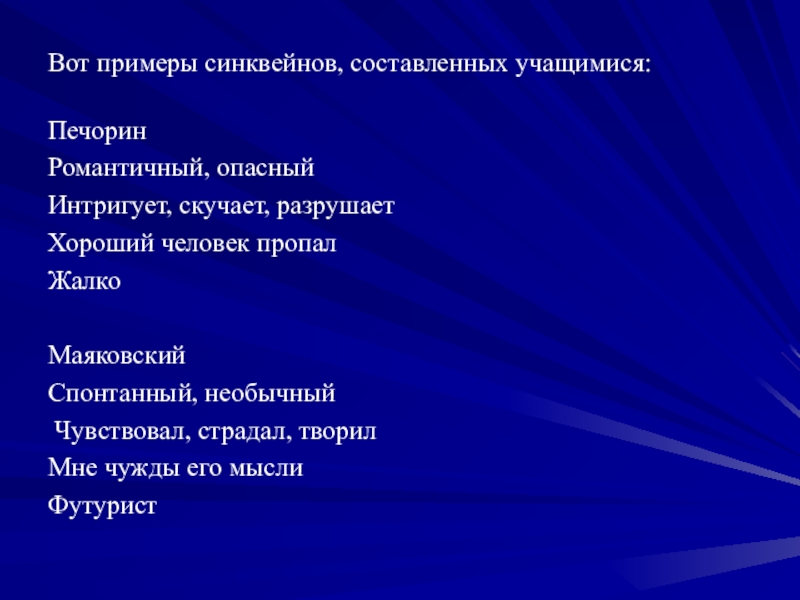 Слайд 32Вот примеры синквейнов, составленных учащимися: