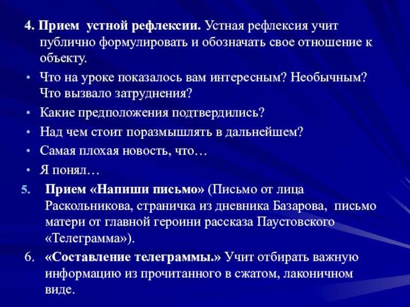 Слайд 304. Прием устной рефлексии. Устная рефлексия учит публично формулировать и обозначать