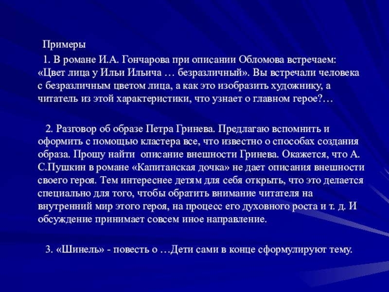 у Ильи Ильича … безразличный». Вы встречали человека с безразличным цветом лица, а как это изобразить художнику, а читатель из этой характеристики, что узнает о главном герое?…