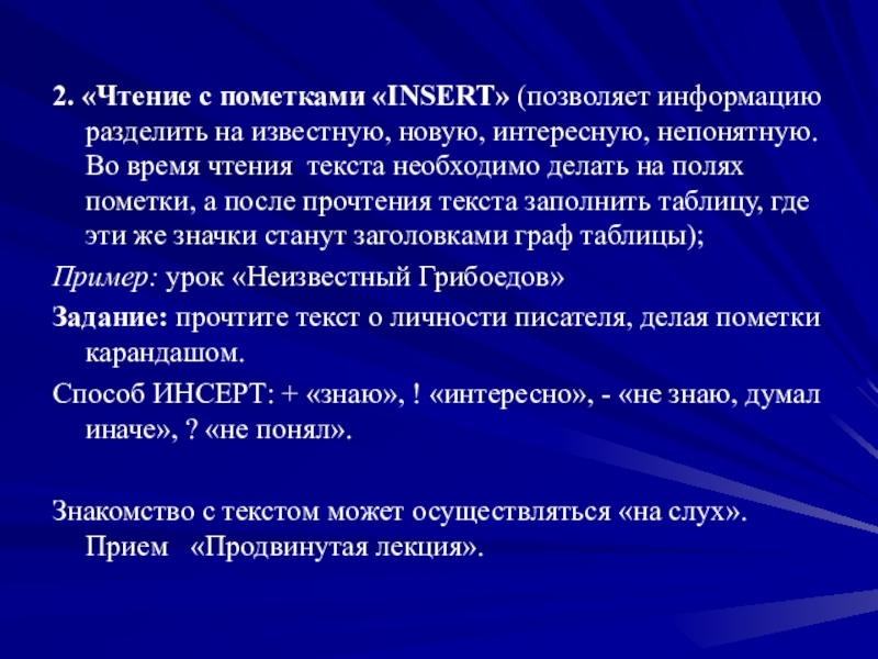 Слайд 202. «Чтение с пометками «INSERT» (позволяет информацию разделить на известную, новую,