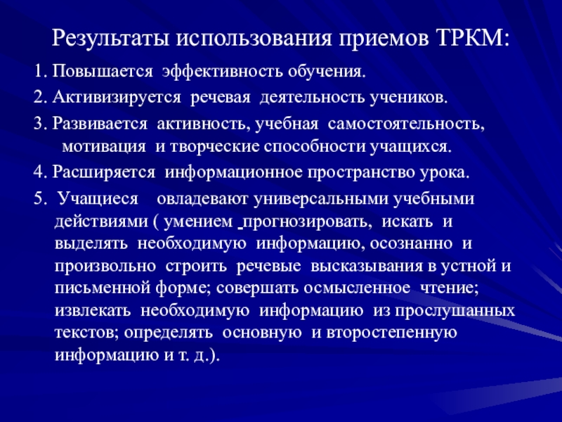 5. Учащиеся овладевают универсальными учебными действиями ( умением прогнозировать, искать и выделять необходимую информацию, осознанно и произвольно строить речевые высказывания в устной и письменной форме; совершать осмысленное чтение; извлекать необходимую информацию из прослушанных текстов; определять основную и второстепенную информацию и т. д.).